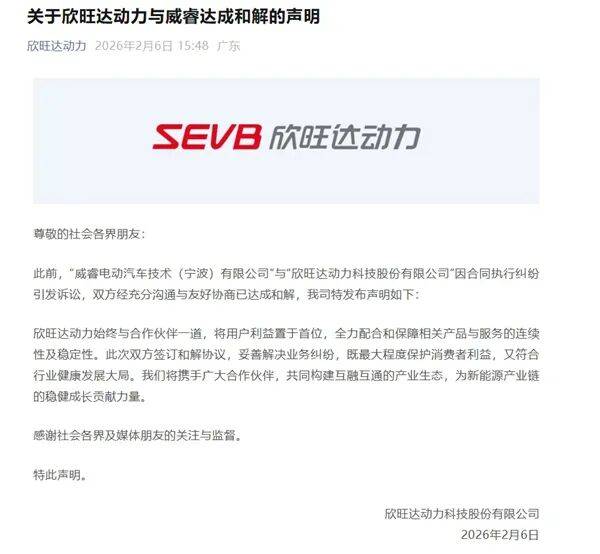 2月6日,欣旺达动力发布声明:威睿电动汽车技术(宁波)有限公司(以下简称“威睿”)与欣旺达动力科技股份有限公司(以下简称“欣旺达动力”)已就此前因买卖合同执行产生的纠纷达成最终和解。