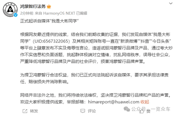 去年3月,鸿蒙智行法务官方微博宣布正式起诉自媒体“我是大彬同学”,称根据网友线索和前期搜集证据,发现该自媒体及其相关矩阵账号在多个网络平台发布针对鸿蒙智行品牌及产品的不实信息和侮辱性言论,对品牌声誉造成不良影响。